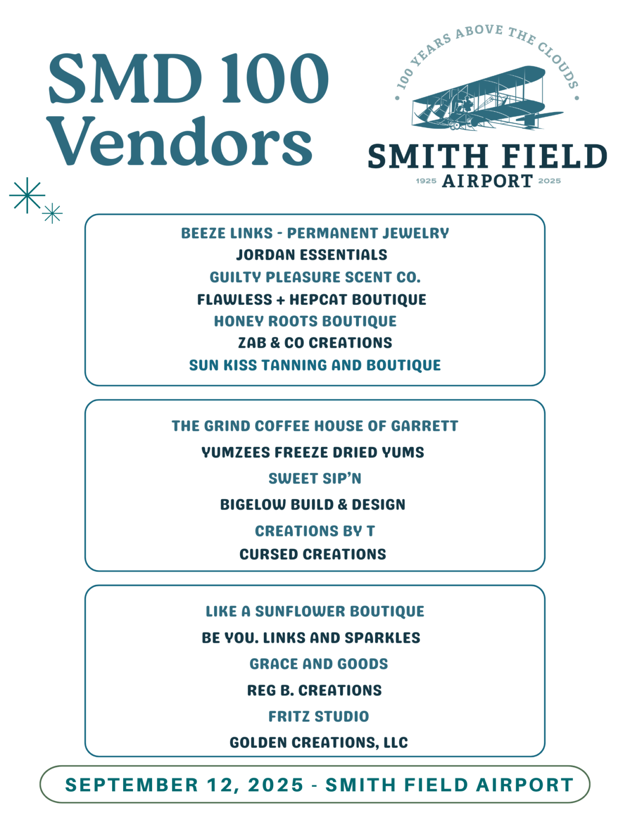 General parking for attendees at SMD 100 will be at First Assembly of God church located off of Washington Center Road for $5 per vehicle. Event parking will be accessible off of Washington Center Road or Ludwig Road via Sharon Drive. ADA parking will be available at Smith Field Airport for attendees needing a closer parking option. FREE parking shuttles will run to and from Smith Field Airport throughout the event.